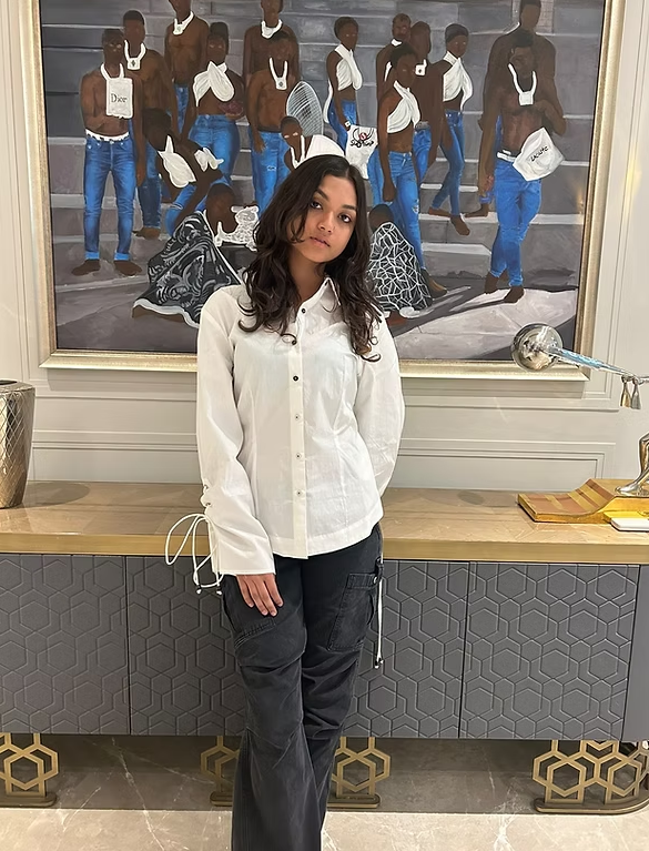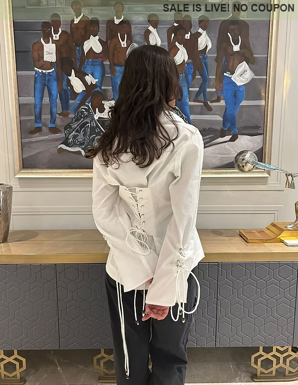 •White cotton cambric shirt featuring intricate tie-up detailing on the back and sleeves, •Offering a unique and stylish twist to a classic design,